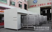 (8)烘干箱內(nèi)可存放1輛推車。推車配置耐高溫角輪(定向輪、萬(wàn)向輪各2個(gè)),推車?yán)锩姘惭b限位柱用于定位里面托盤(pán),兩側(cè)配有L形托架,用于支撐及左右限位托盤(pán)。進(jìn)出口裝有手動(dòng)爐門(mén)。頂部部置循環(huán)風(fēng)機(jī)、蒸氣換熱器等裝置,排廢風(fēng)機(jī)安裝在爐體頂部。